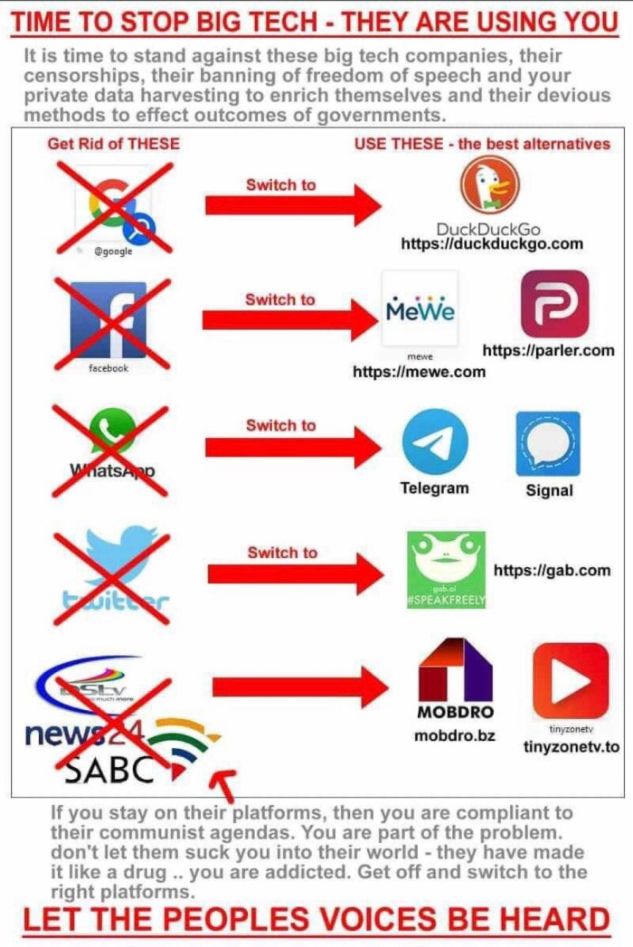 The dogs known as Google and Apple have removed the Parler app. That says it all! Check out this chart to help you make the switch. Share it with your friends: